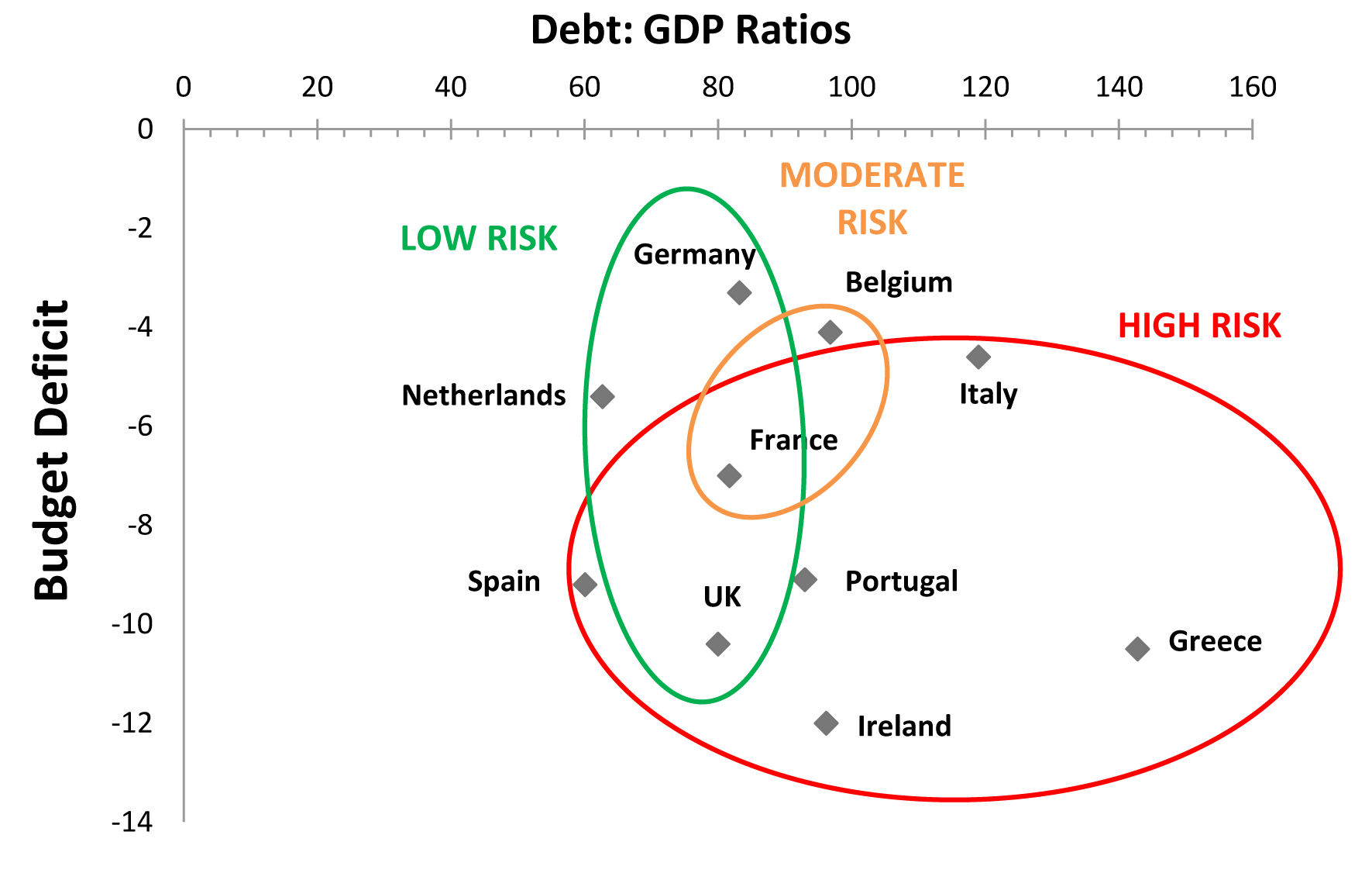 - The general government (GG) debt to GDP ratio (an ideal ‘compliance’ ratio and precondition for joining the euro being 60%), is now projected to stand at 123% this year, falling to 116% by 2015, marginally better than originally predicted in December.
